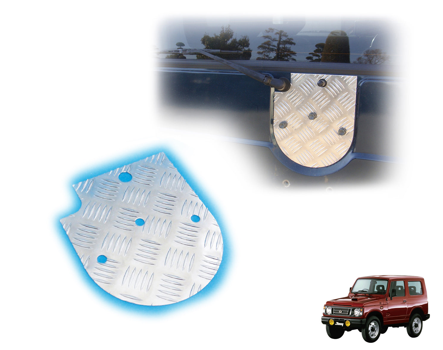 材料にアルミ縞板2.0mm厚(凸部は3.0mm)を使用しておりますので、強度にドレスアップにバッチリです♪ 純正スペアタイヤブラケットを取り外した際に、リアゲートに残ってしまうホール部分に取り付ける化粧プレートで、ワンポイントに最適です♪ スペアタイヤブラケットが腐食して、錆びが移ってしまった部分を隠すのにも最適です!! ※ワイパーとシャワーノズルの部分を逃がしてありますので、スペアタイヤブラケットを止めているボルトで取り付けるだけと超簡単装着です♪ スペアタイヤブラケットを固定していたボルトで固定します。 ※別途¥400でステンレス製のボルト(5式)をご用意できます。下記の一覧から「ステンレスボルト付き」を選択下さい。 |