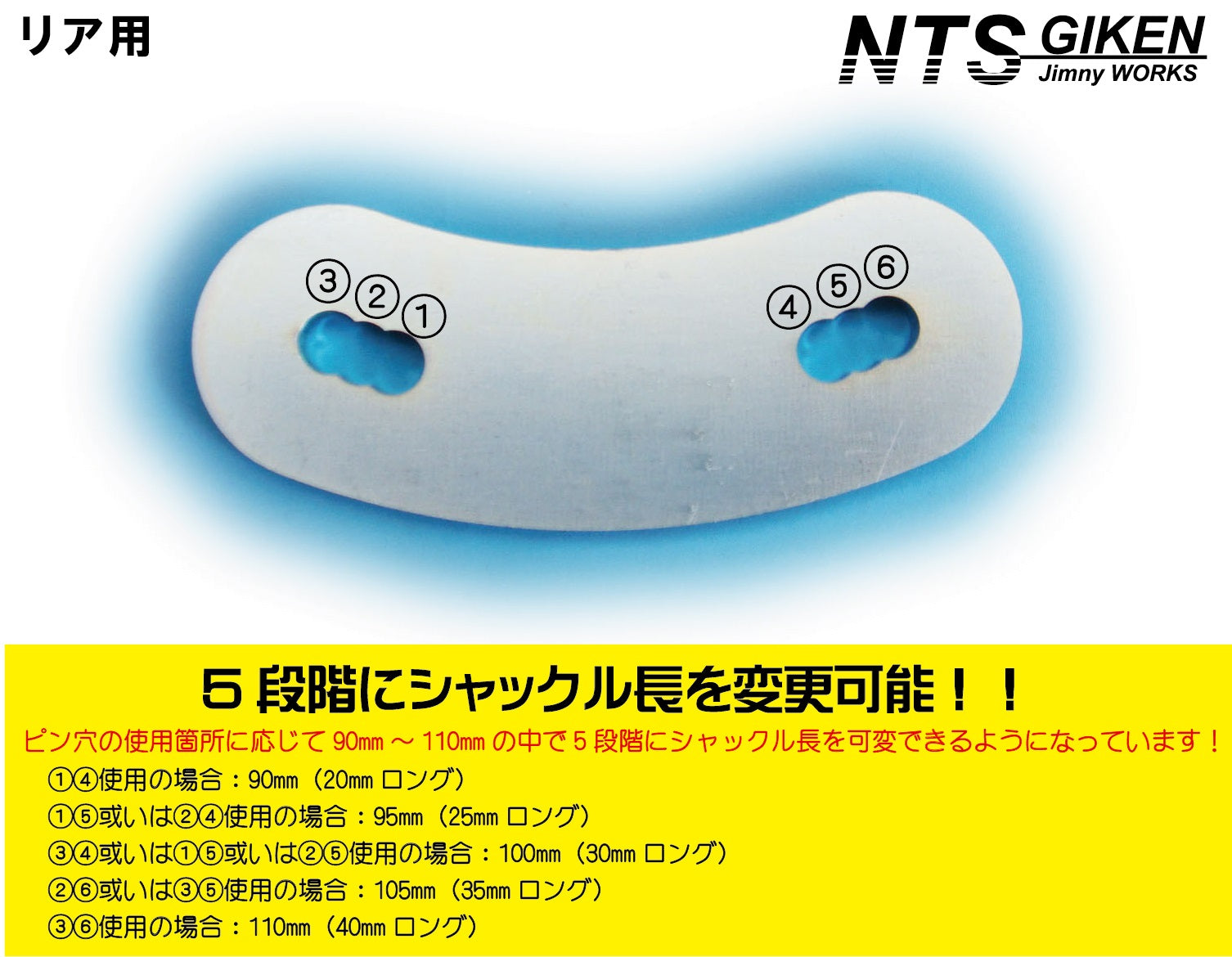 1ヶの価格になります。 ※こちらの商品はリアのリーフ側のピン径がφ14のものになります。SJ10~JA71は社外リーフ装着以外はピン径がφ13となりますので、ピン径がφ13の場合は「フロント用」をご購入下さい。 ※車検の際に必要な強度計算書は別売700円です。 シャックルプレートにスチール鋼材の6.0mm厚、シャックルピンに機械構造用炭素鋼材(S45C)を使用していますので、強度はバッチリです♪クロカンで耐久性を立証済みです! ☆本シャックルは、ピン穴の使用場所に応じて90mm~110mmの間で5段階にシャックル長を可変できるようになっています! 1と4を使用の場合:90mm(20mmロング) 1と5或いは2と4を使用の場合:95mm(25mmロング) 3と4或いは1と6或いは2と5を使用の場合:100mm(30mmロング) 2と6或いは3と5を使用の場合:105mm(35mmロング) 3と6を使用の場合:110mm(40mmロング) 上記のように5段階に長さを変えることができますので、サスチューンの幅が広がり、モーグルからだートラまで幅広いサスチューンが当該シャックルで行うことができます♪ また、足が伸びた際にシャックルストッパーに干渉しにくいブーメラン型となっています!! ※画像には映っていませんが、ブッシュ巻き込み防止のステンレス製スペーサーが付属しています。 |