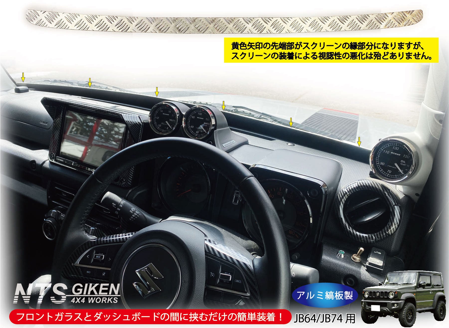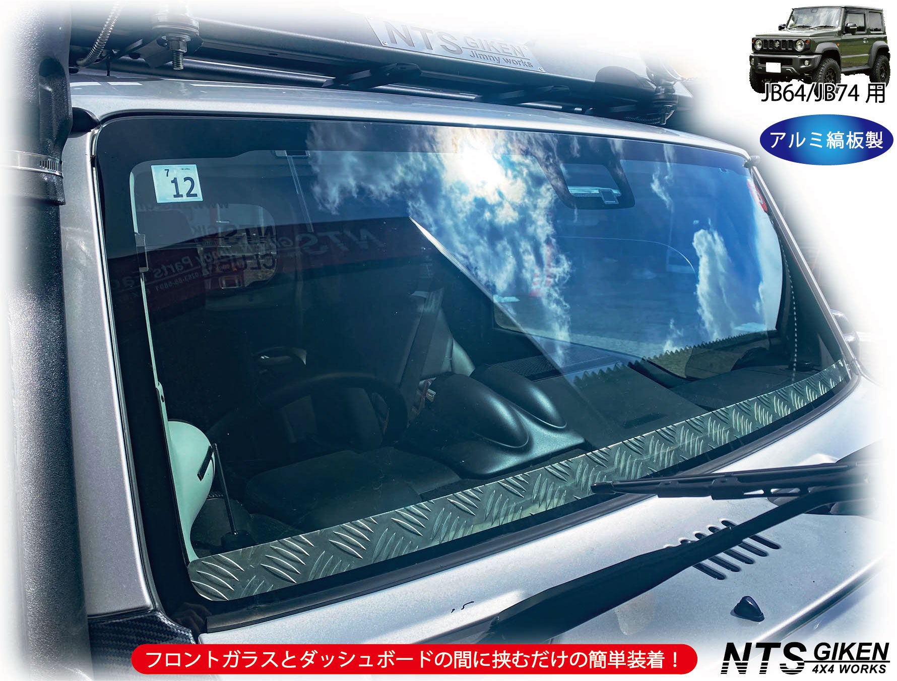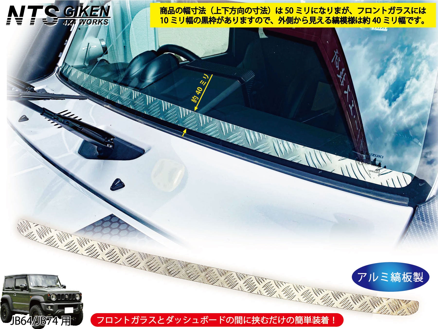 フロントガラスとダッシュボードの間に挟み込んで使用するアクセントパネル(フロントスクリーン)になります。 本商品は幅寸法が50ミリ(ガラスの黒縁を考慮すると40ミリ)と薄幅に製作しましたので、運転者の視界を妨げるものではなくワイパーブレードの高さより僅かに高いだけのため、運転者からの視認性の悪化は殆どありません。※出品画像参照 しかしながらフロントガラスへのフロントスクリーン(装飾板)の装着は禁止されているため、本商品は、撮影・イベント用となります。取り付けは自己責任でお願いします。 ・フロントガラスとダッシュボードの間に挟むだけの簡単装着です(両面テープ等不要)。 ・簡単な取り付け説明書が付属しております。 ・材質:アルミ縞板(チェッカープレート)2ミリ厚製(凸部は3ミリ厚) ・カラー:アルミ素地 ・サイズ:横 約1,225mm×縦 約50mm ・取付方法:フロントガラスとダッシュボードの間に挟んで装着 ・対応車種:ジムニーJB64 ジムニーシエラJB74 ・その他:公道での使用は禁止です |