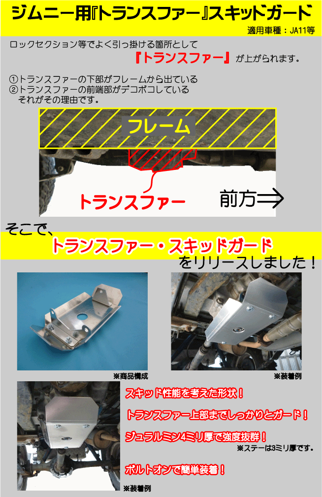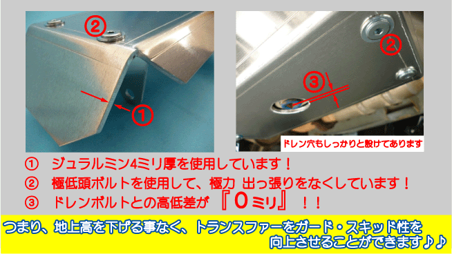 本商品は、材料にジュラルミン4ミリ厚(ステーは3ミリ厚)を使用しておりますので、トランスファーをガッチリとガードすると共に、その形状からスキッド性能も優れて行います!