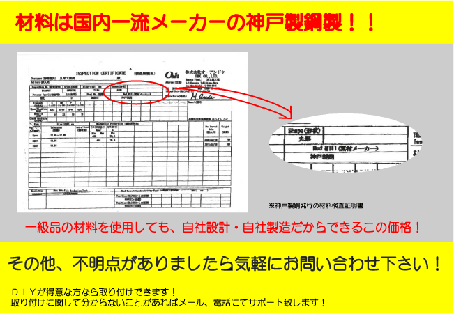 シャックルプレートにスチール鋼材の5.0mm厚、シャックルピンに圧造用炭素鋼線を使用していますので、強度はバッチリです♪クロカンで耐久性を立証済みです!