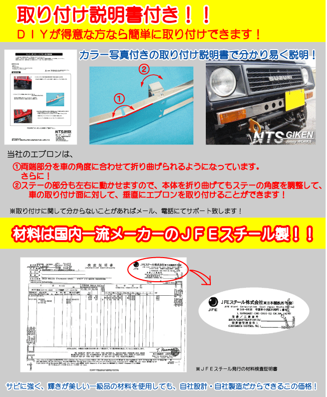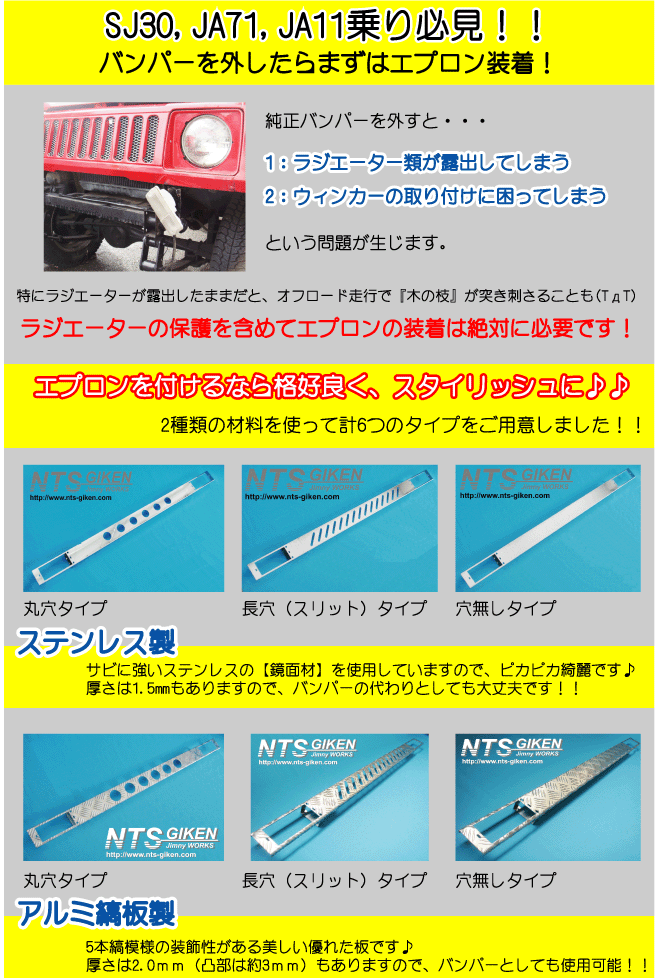 ジムニー用ステンレス製フロントエプロン(長穴タイプ)適用車種:SJ30,SJ40,JA71,JA51,JA11,JB31