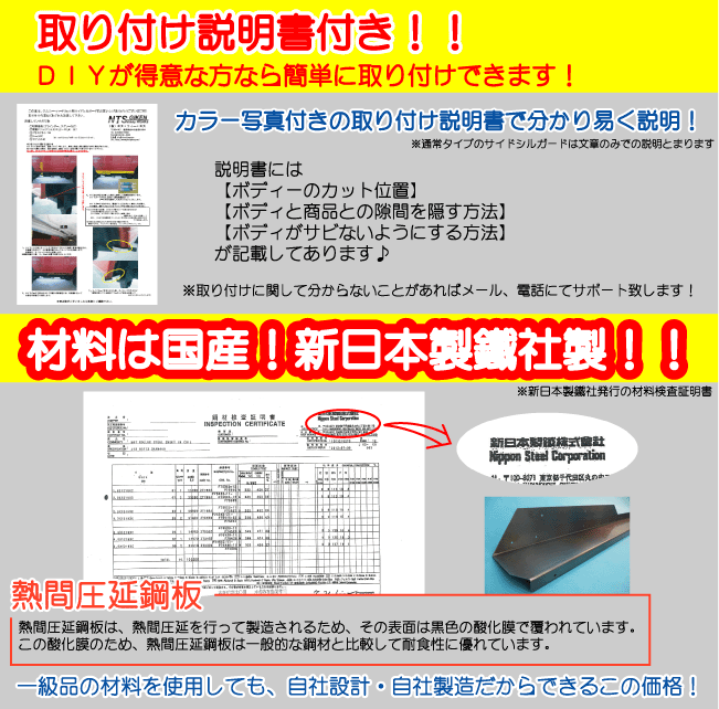 サイドシルの部分をカット、或いは折り曲げして取り付けるタイプのサイドシルガードで、サイドシル部分を大幅にカット(折り曲げ)してしまうので、障害物でサイドシル部分をヒットさせて破損させてしまうことがなくなります♪