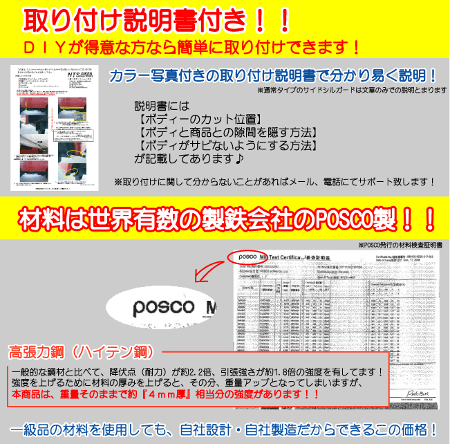 サイドシルの部分をカット、或いは折り曲げして取り付けるタイプのサイドシルガードで、サイドシル部分を大幅にカット(折り曲げ)してしまうので、障害物でサイドシル部分をヒットさせて破損させてしまうことがなくなります♪