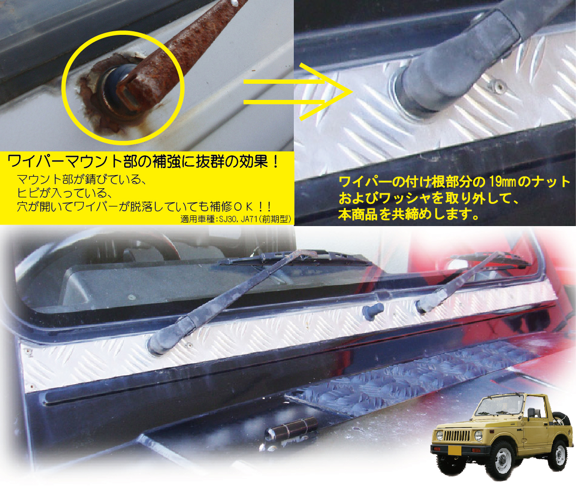 ジムニー用アルミ縞板製ワイパーマウント補強プレートType30 適用車種:SJ30,SJ40,JA71(一部車種),JA51(一部車種)
