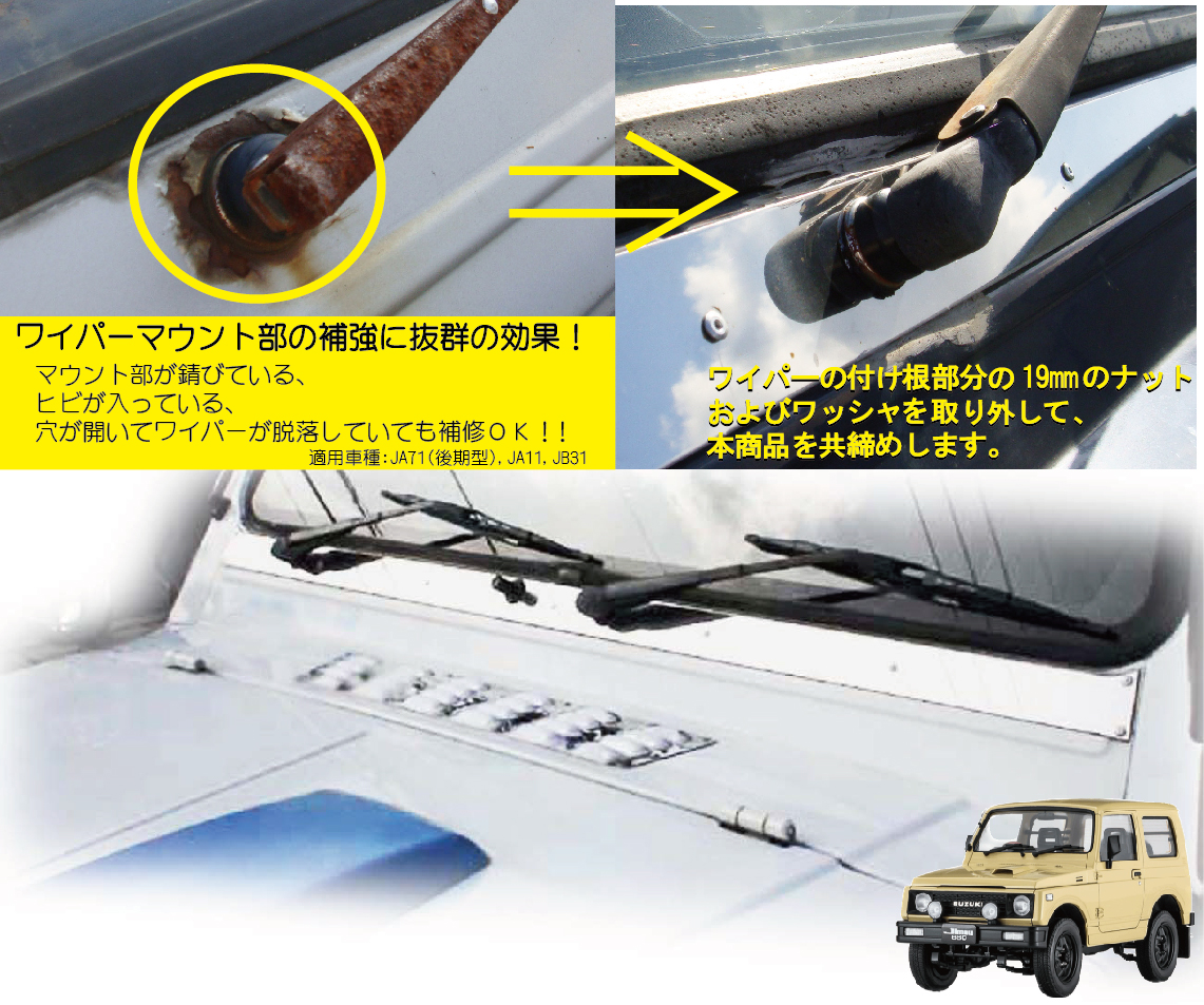 ジムニー用ステンレス製ワイパーマウント補強プレートType11 適用車種:JA71(一部車種),JA51(一部車種),JA11,JB31